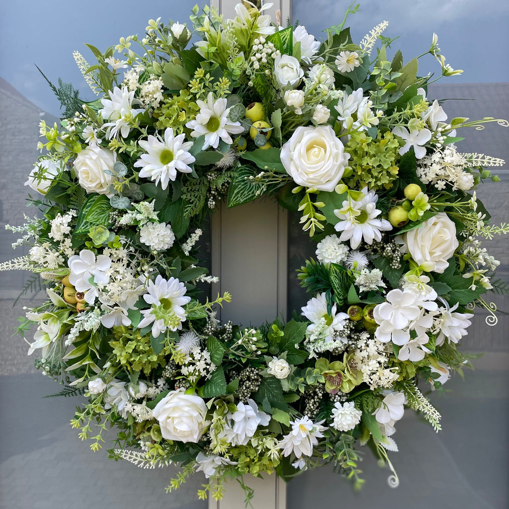 Our Luxury large neutral white and green Year Round wreath is expertly designed with extra large dimensions to make a sophisticated statement year round. Crafted with premium artificial foliage and florals including roses, hydrangeas, daisies and ivy, it offers a realistic look and feel while the neutral color palette ensures it fits any decor. Make a lasting impression with this premium door wreath.