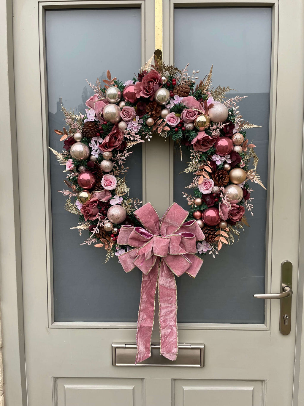 Elevate your holiday decor with our extra large luxury Christmas wreath in pink and burgundy. This one-of-a-kind design exudes elegance and adds a touch of luxury to any space. Measuring 60cm, it's perfect for making a statement.
