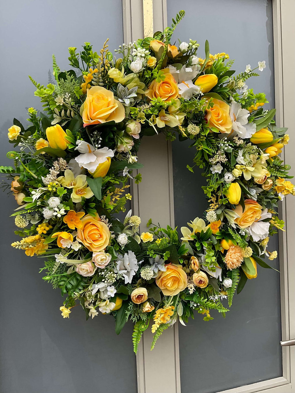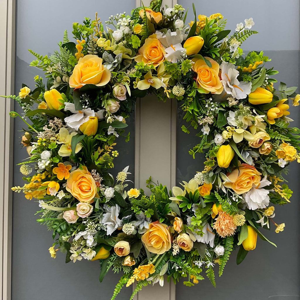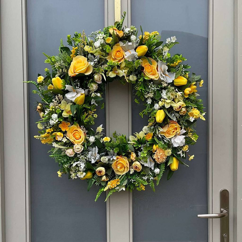 Transform your space with the extra large luxury yellow and white Spring wreath. This stunning wreath features lifelike roses and tulips, adding vibrant yellow colour and texture to any setting. Add a touch of elegance and warmth to your home decor and welcome the beauty of Spring into your home!