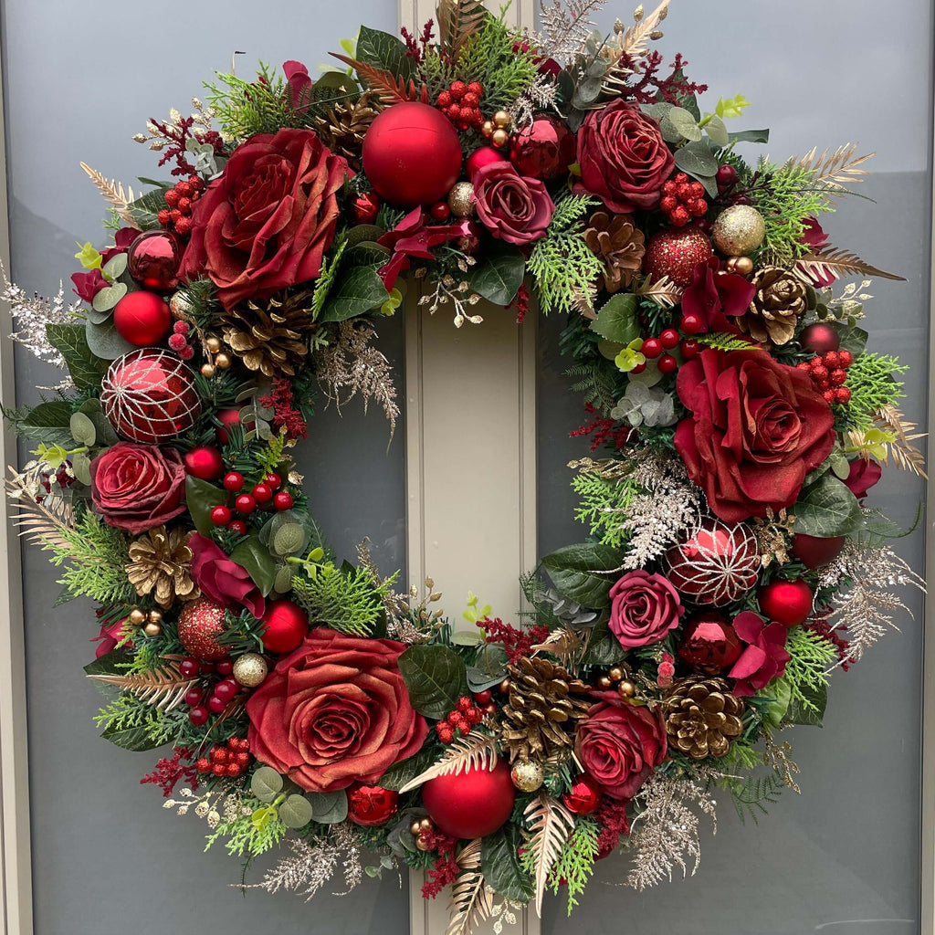 Be the talk of the town with this premium quality artificial wreath in rich red. Photographed is the 60cm luxury handmade Christmas wreath boasting a grand display of two sizes of red and burgundy roses with deep red as the main theme and a hint of gold, this wreath will make a stunning statement wherever it's placed.