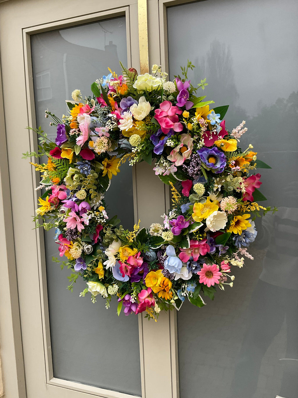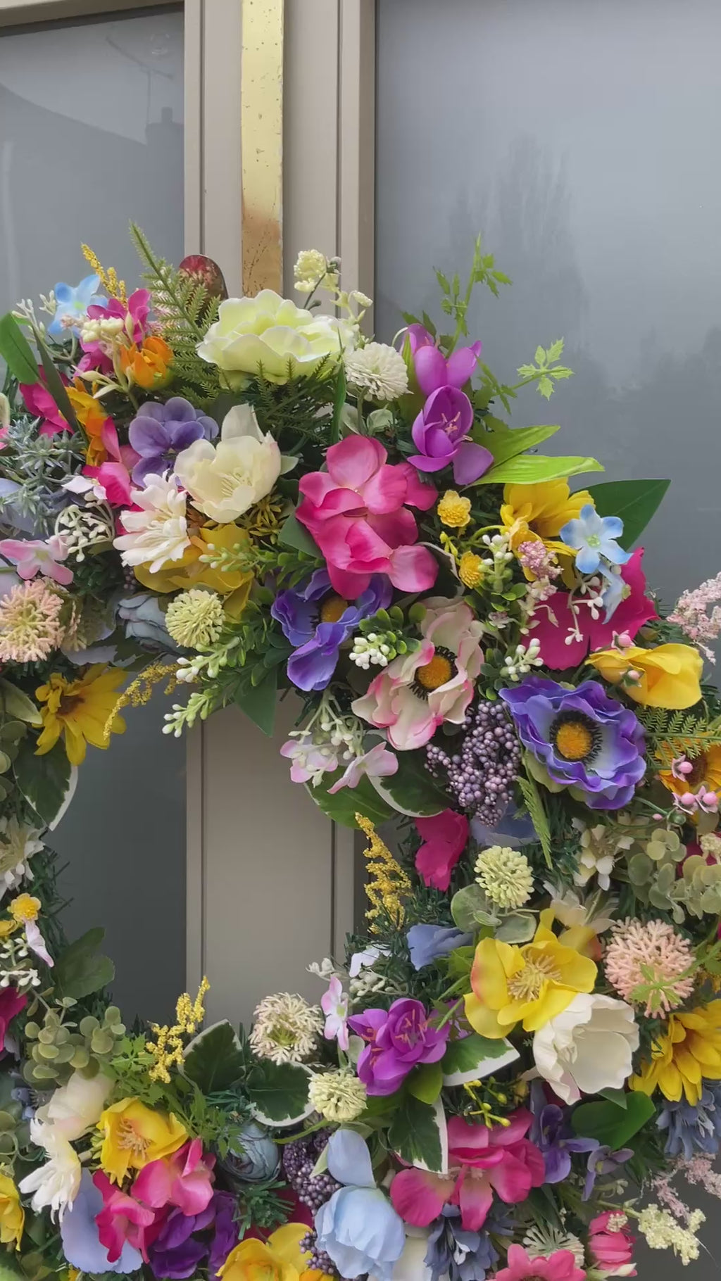 Limited edition extra large 60cm multicolour artificial wreath featuring hydrangea, tulips, ranunculus and roses. An abundance of colour including yellows, blues and purples are intricately designed in this stunning wreath.